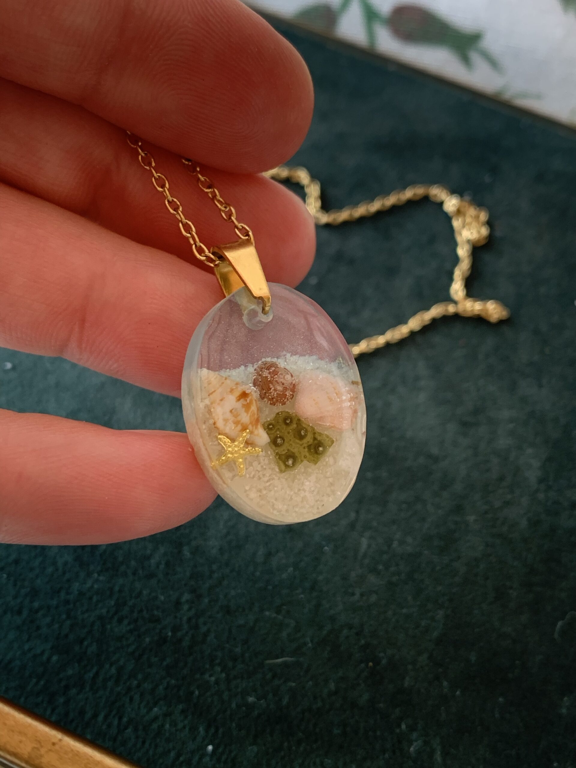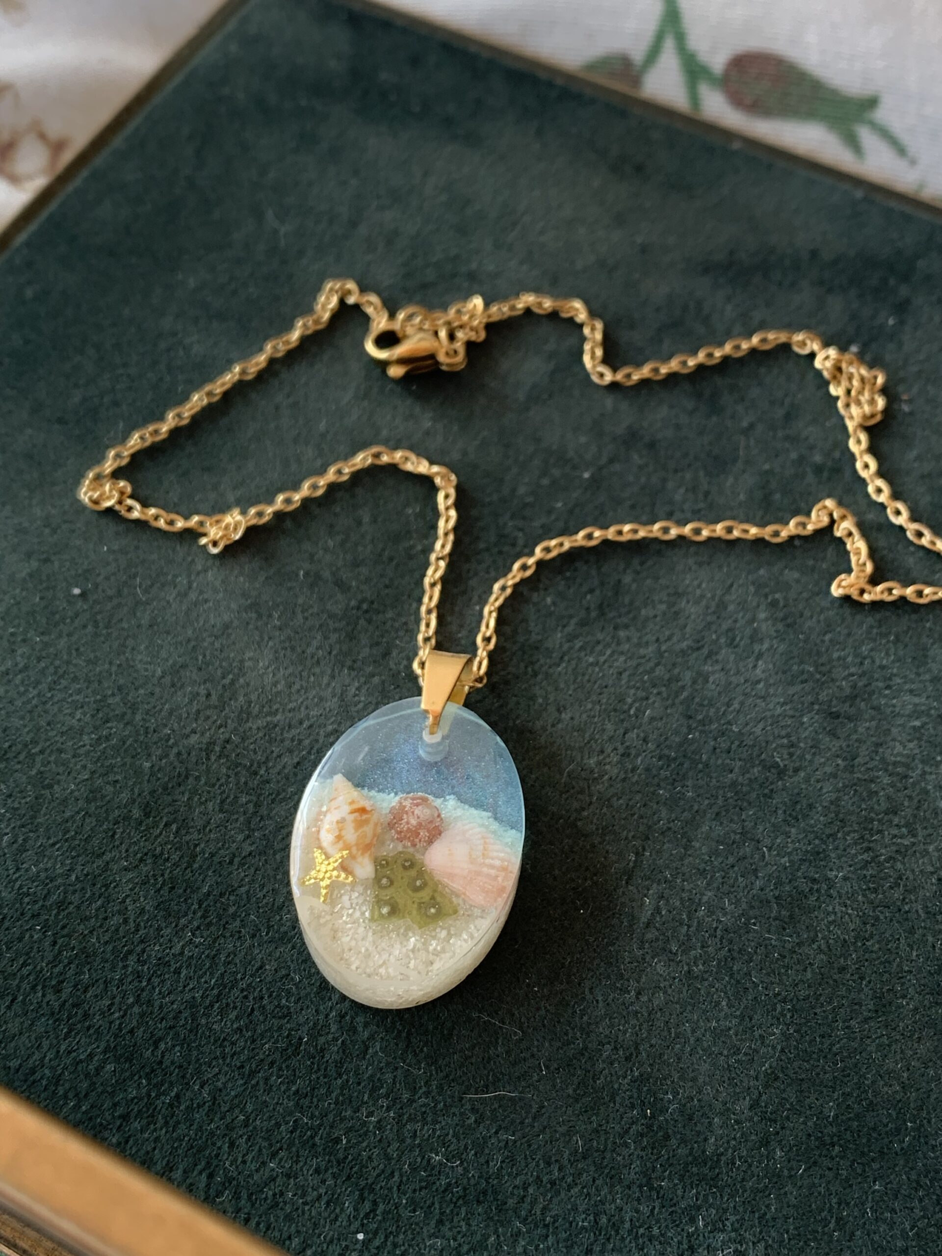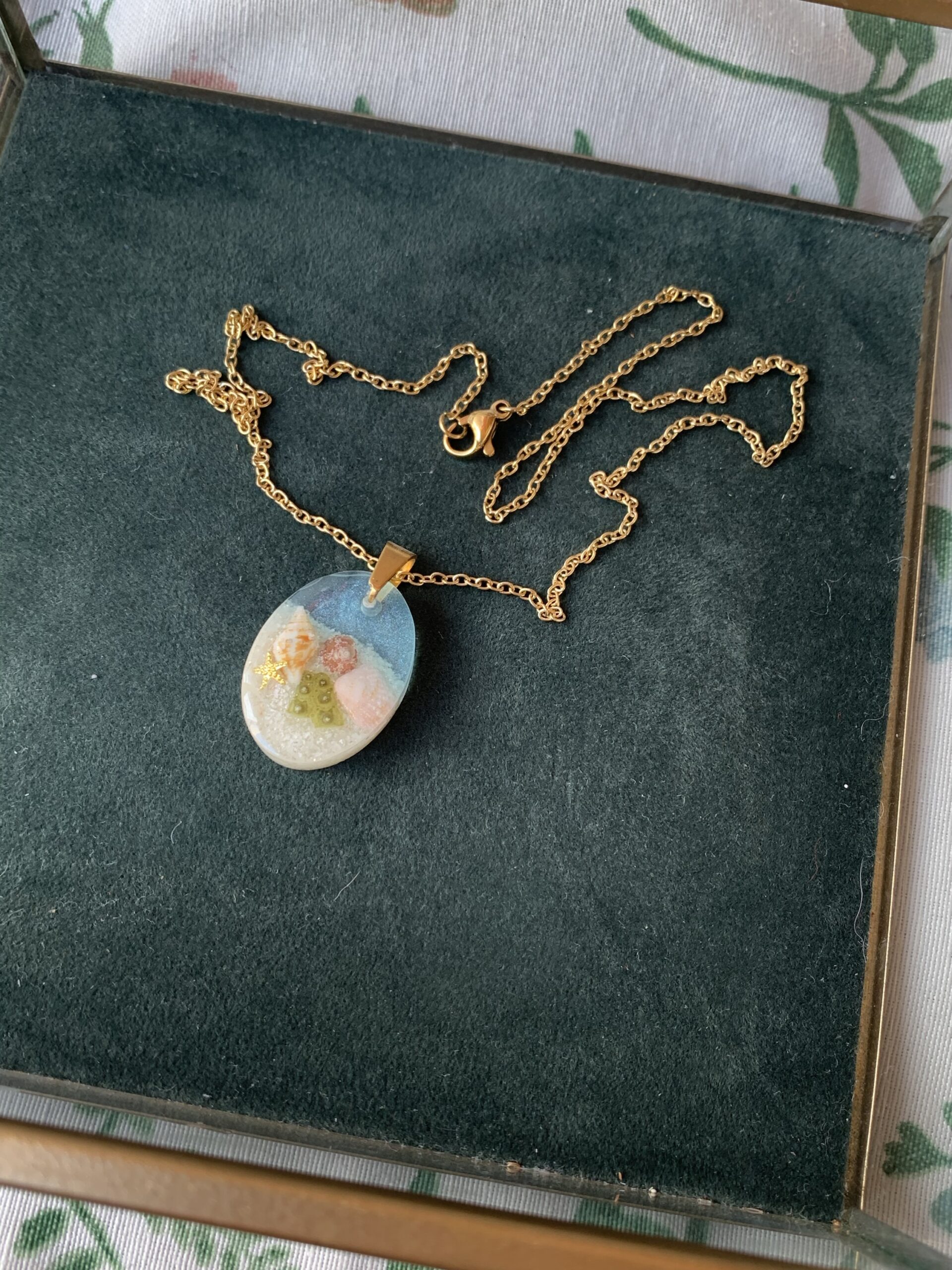 Collar artesanal hecho a mano de resina epoxi con arena y conchas. Tiene cadena de acero inoxidable de color oro.