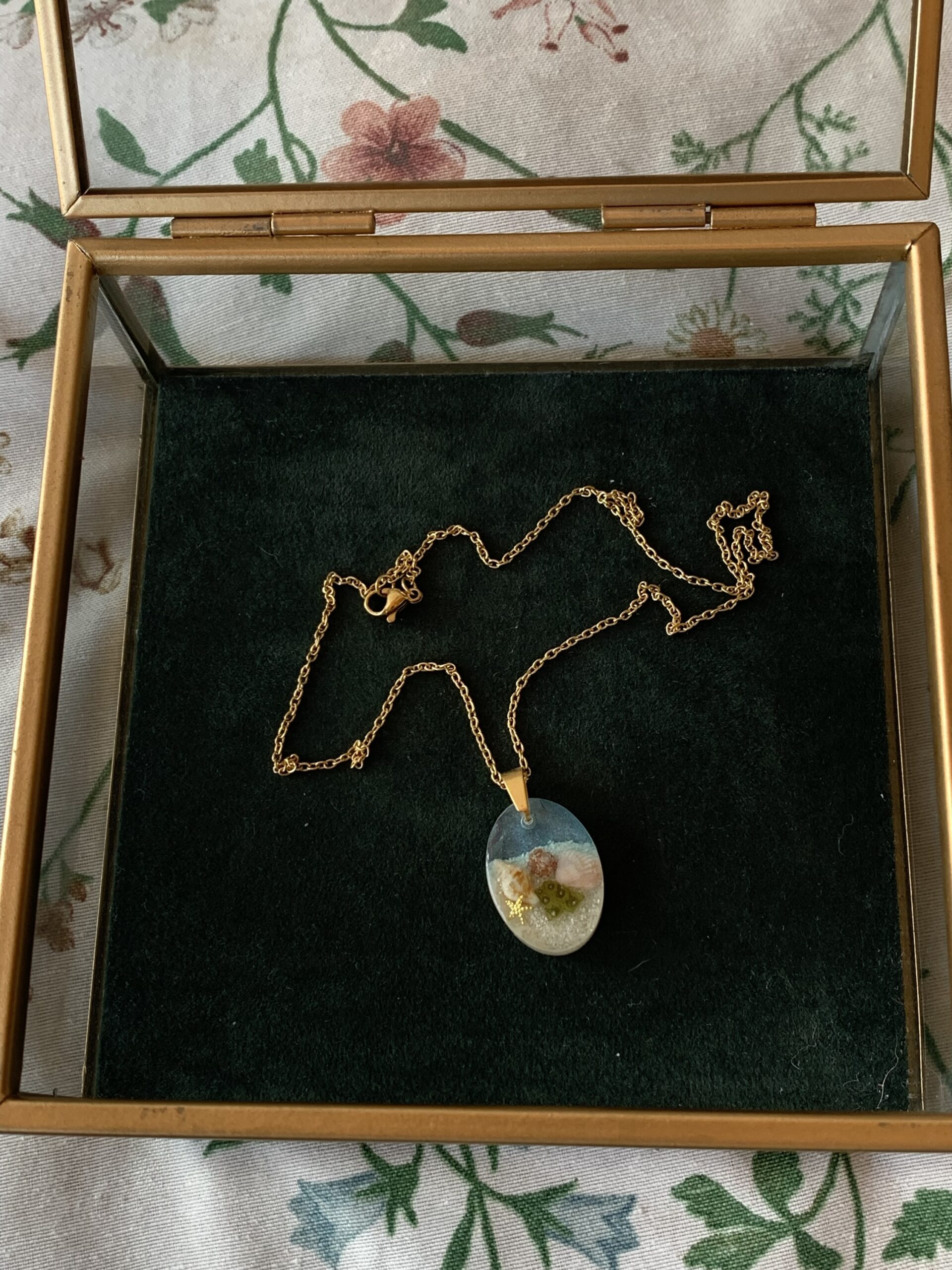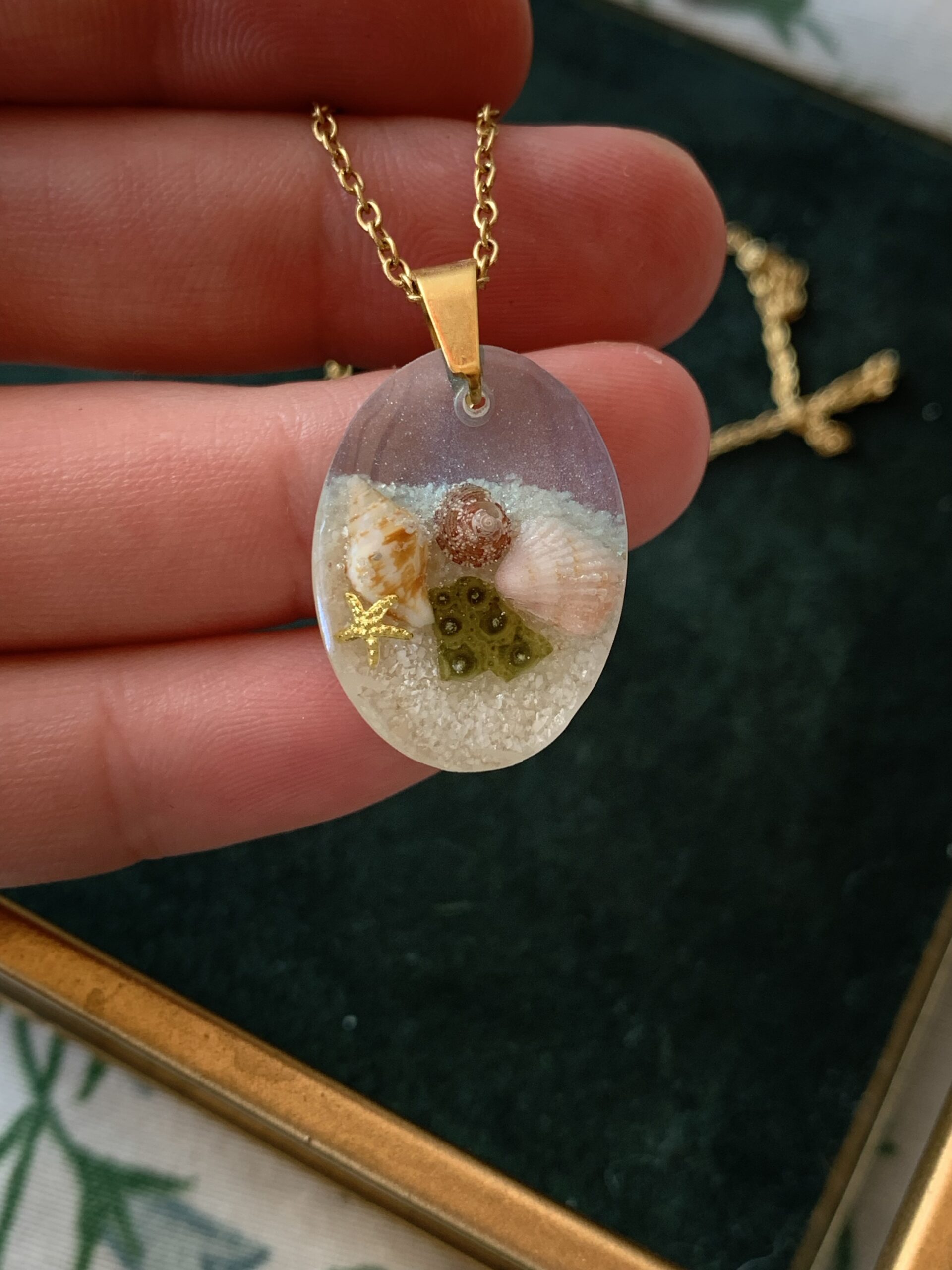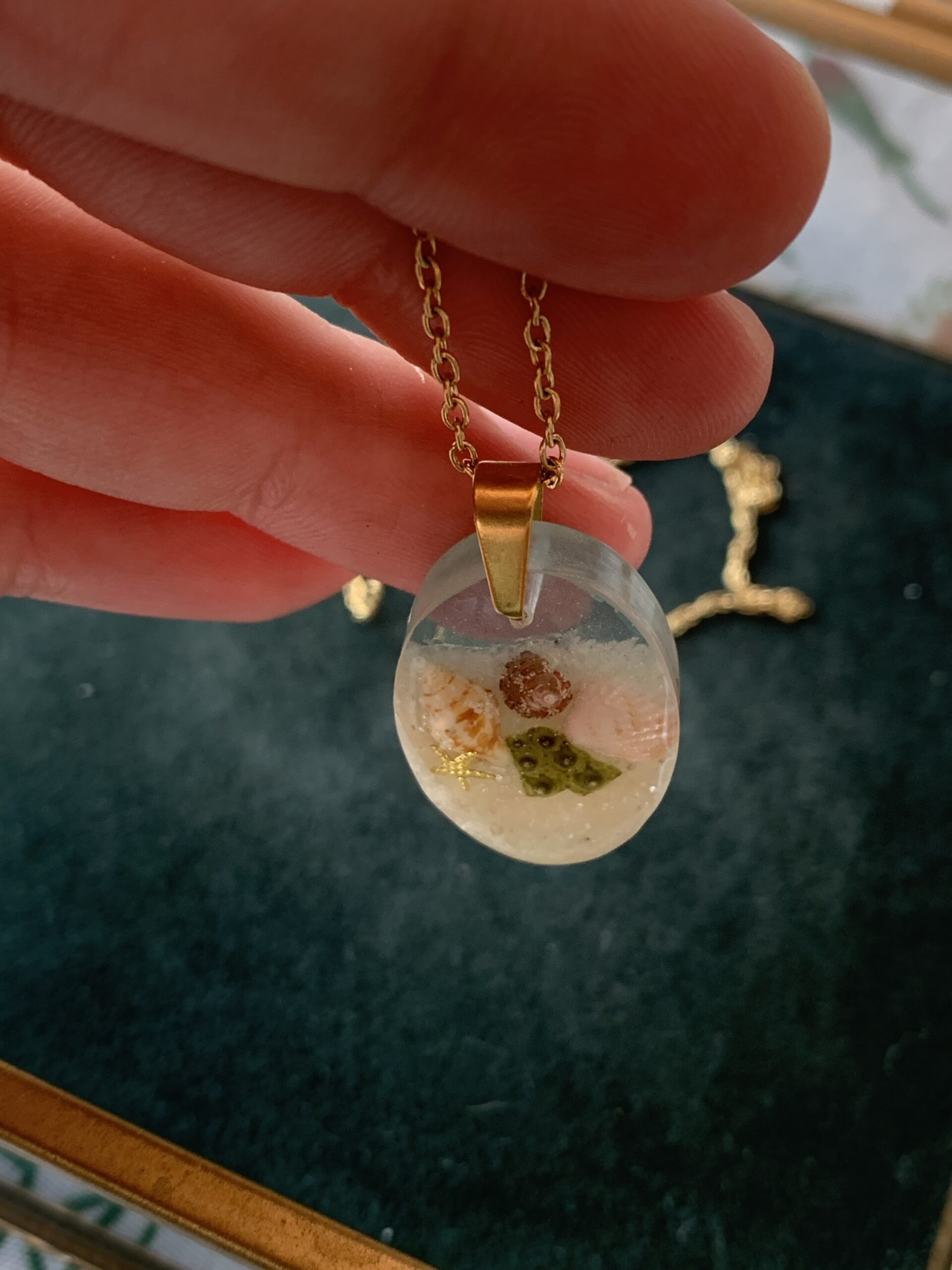 Collar artesanal hecho a mano de resina epoxi con arena y conchas. Tiene cadena de acero inoxidable de color oro.