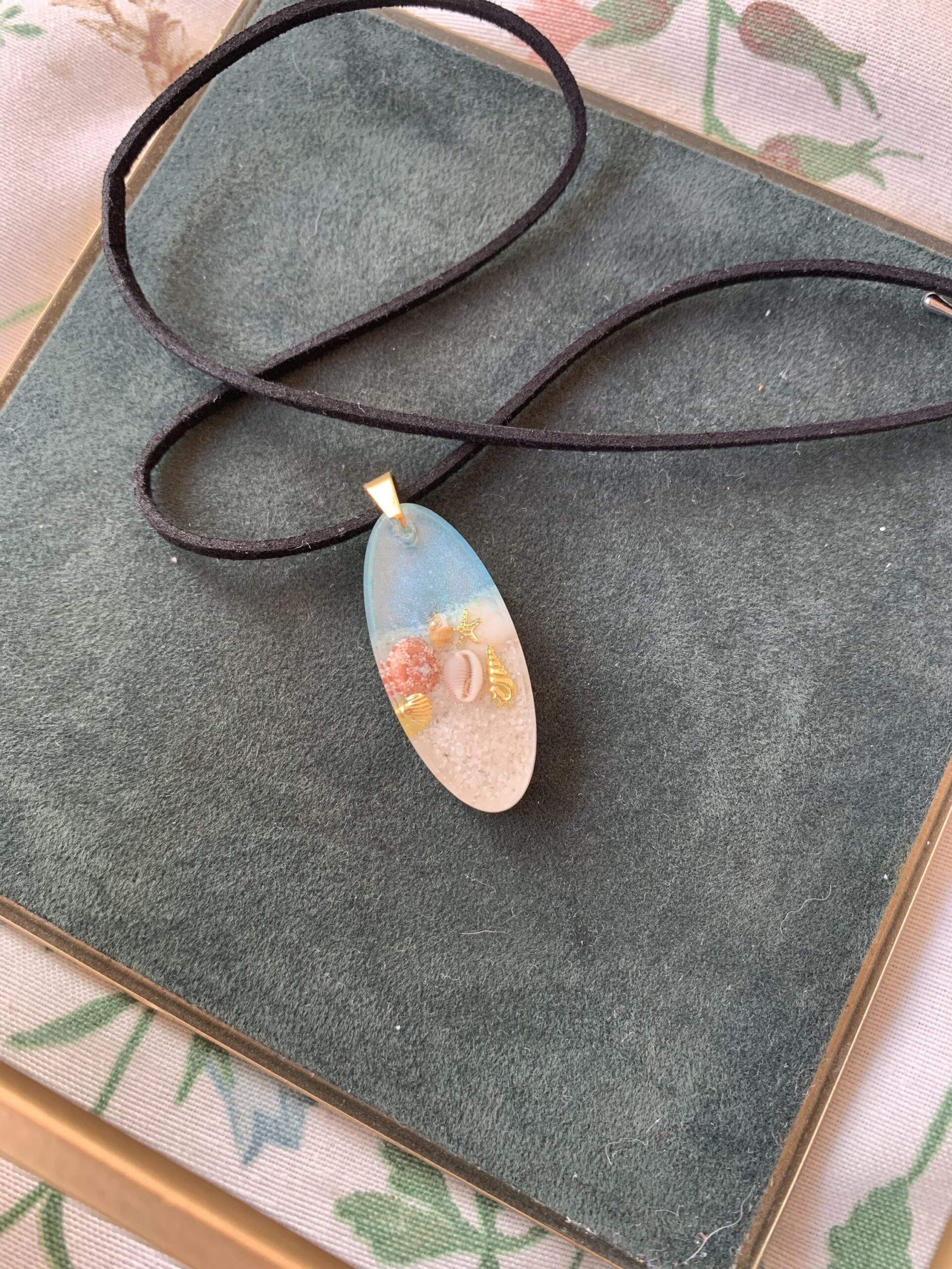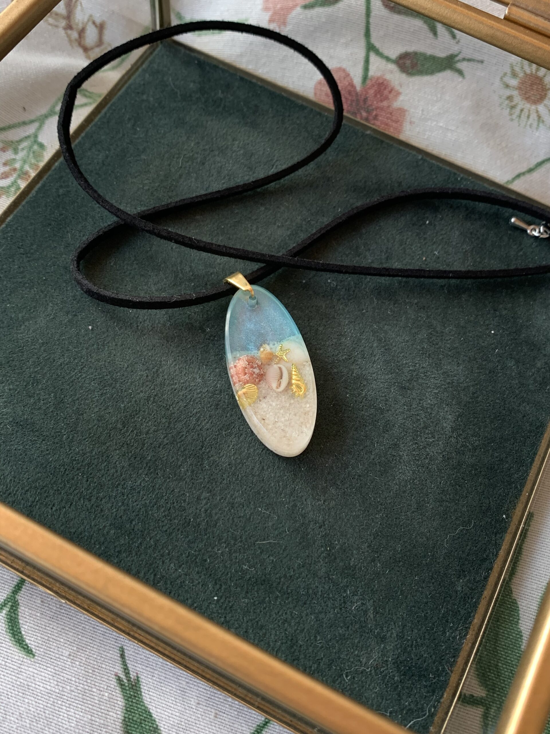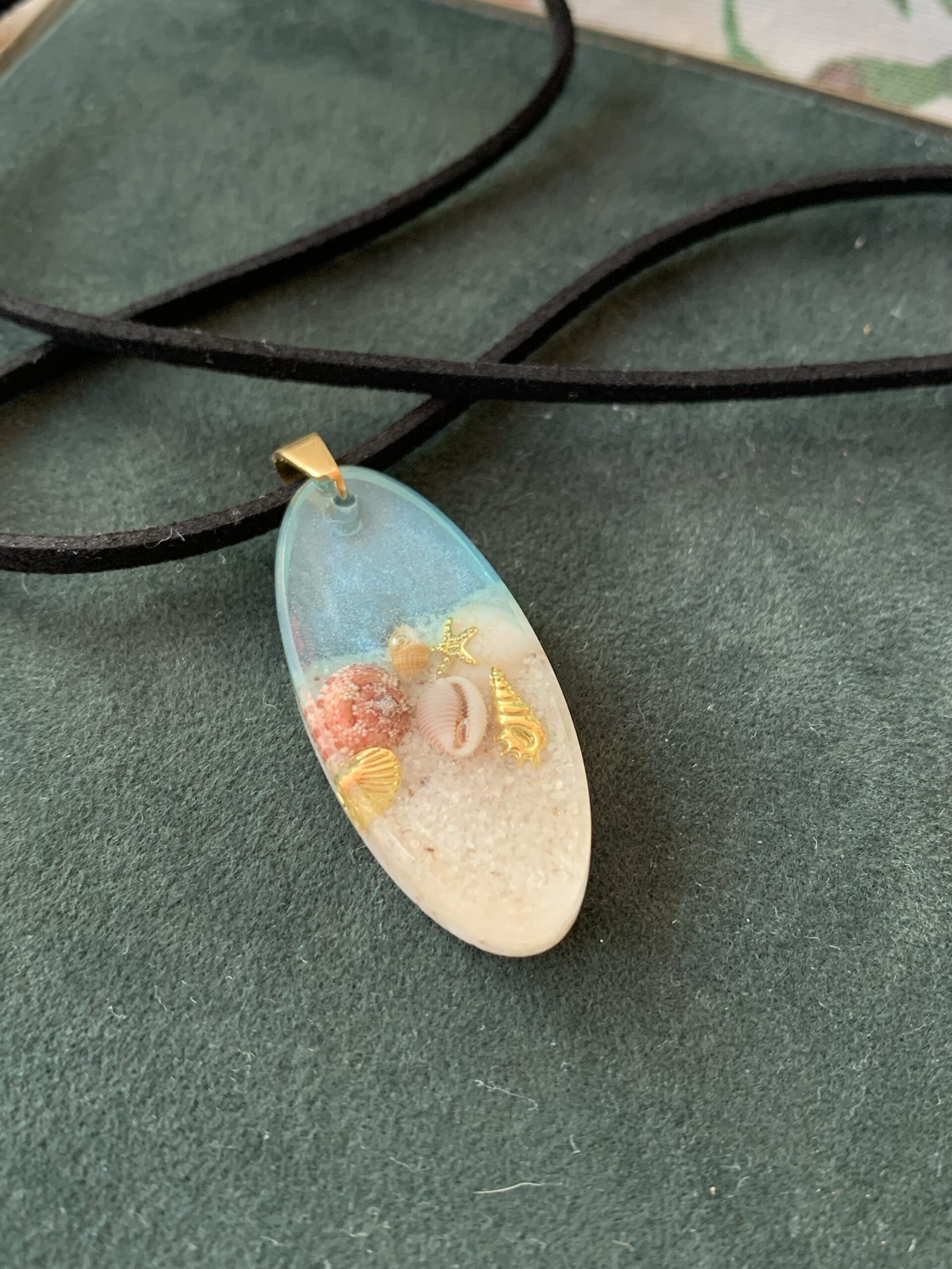 Collar hecho a mano de resina epoxi con arena y conchas. Tiene un cordón negro de ante que mide aproximadamente 45 cm.