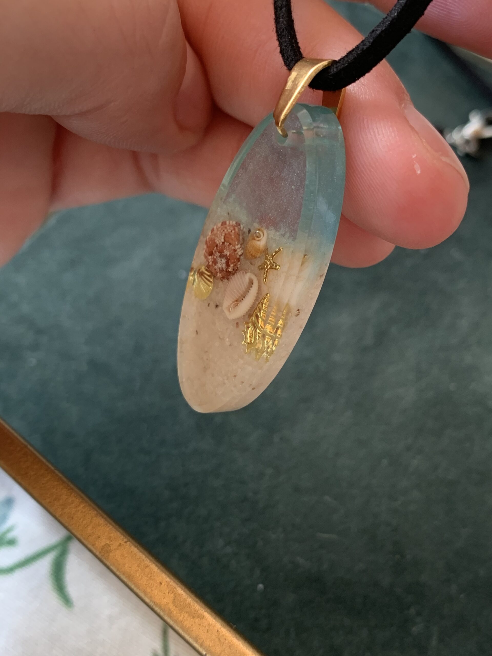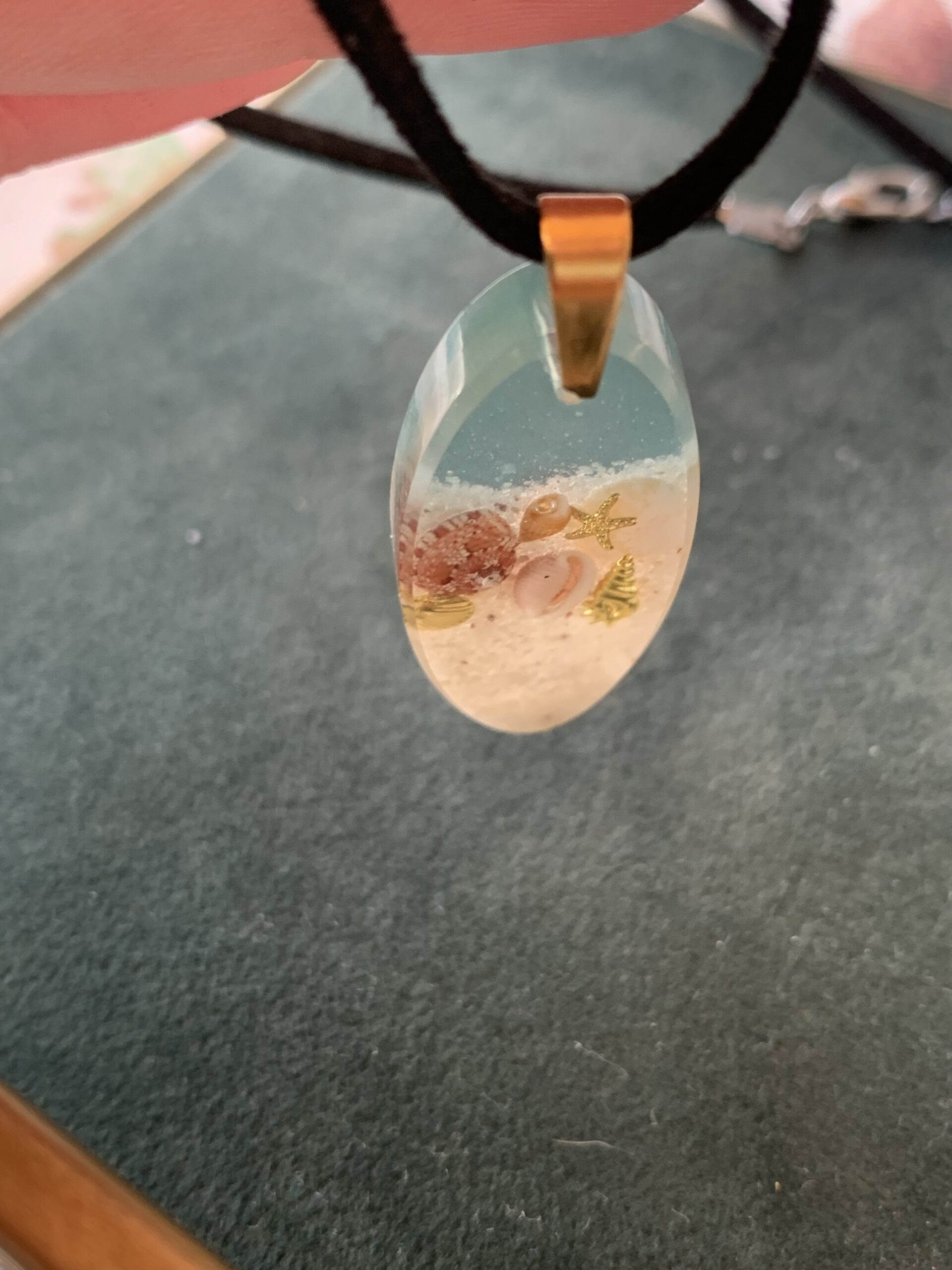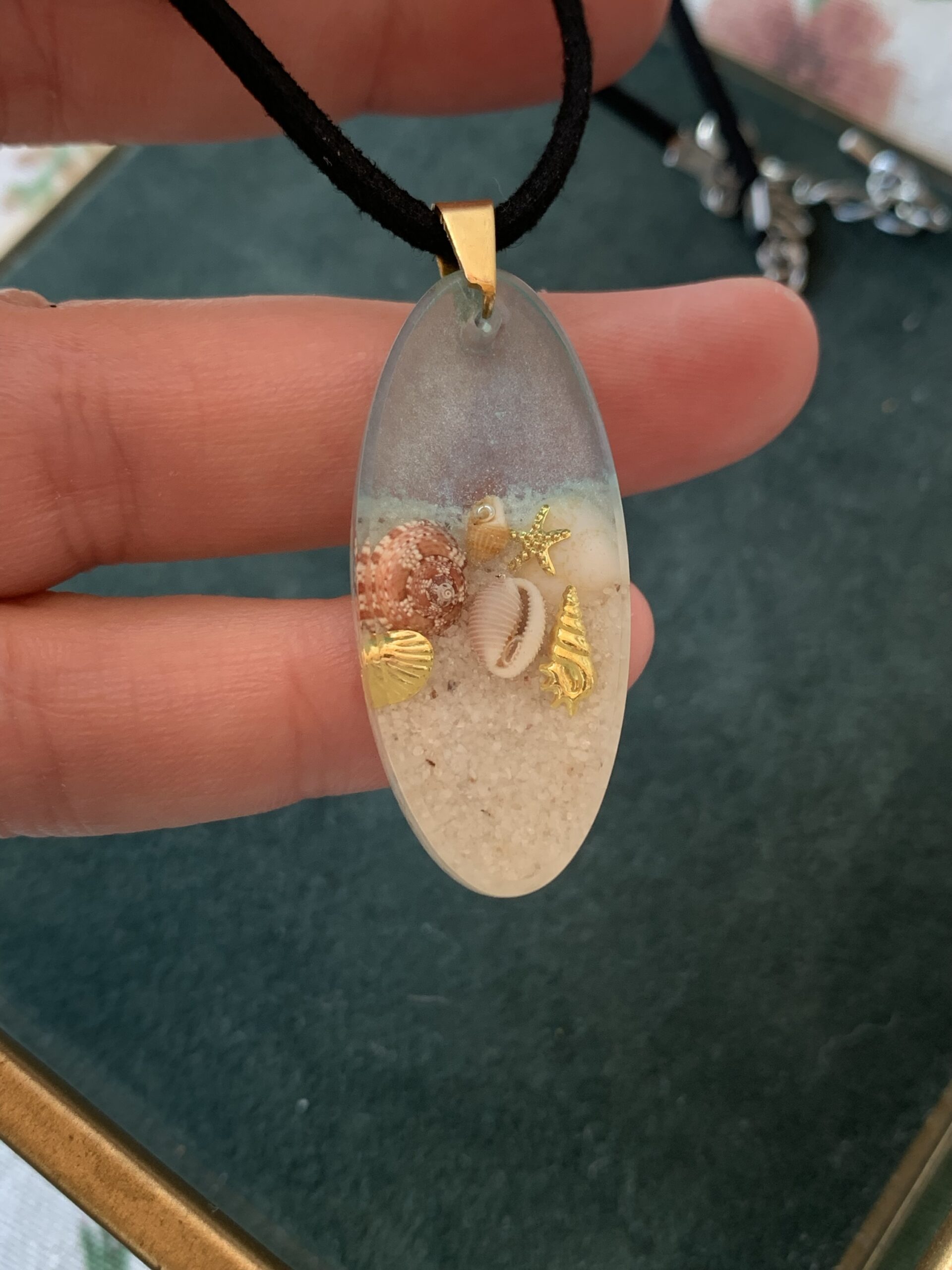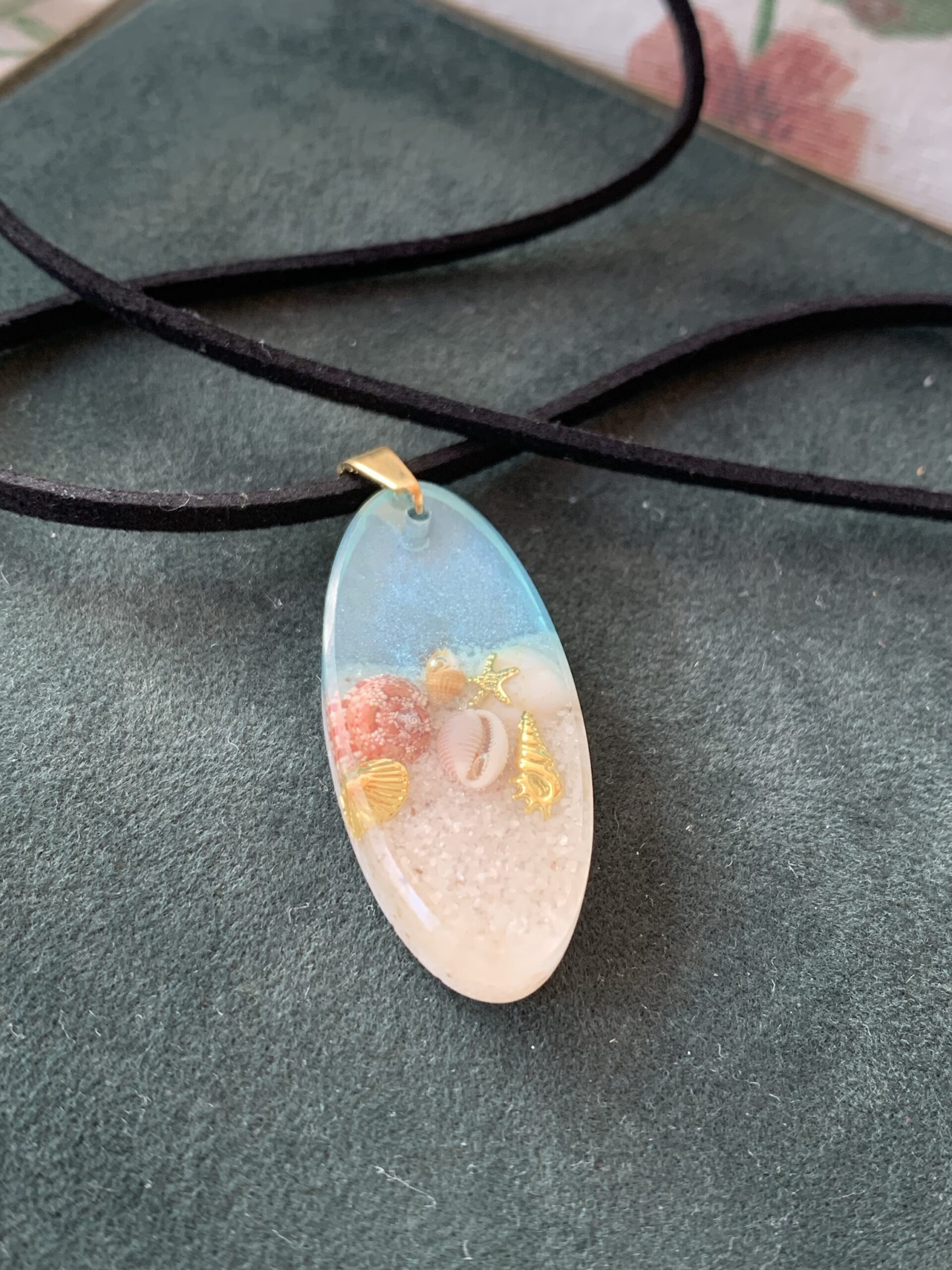 Collar hecho a mano de resina epoxi con arena y conchas. Tiene un cordón negro de ante que mide aproximadamente 45 cm.
