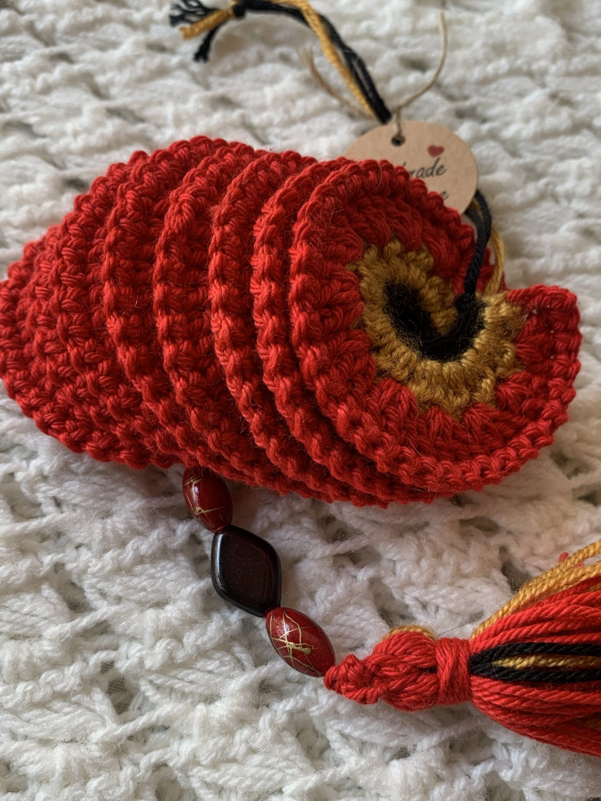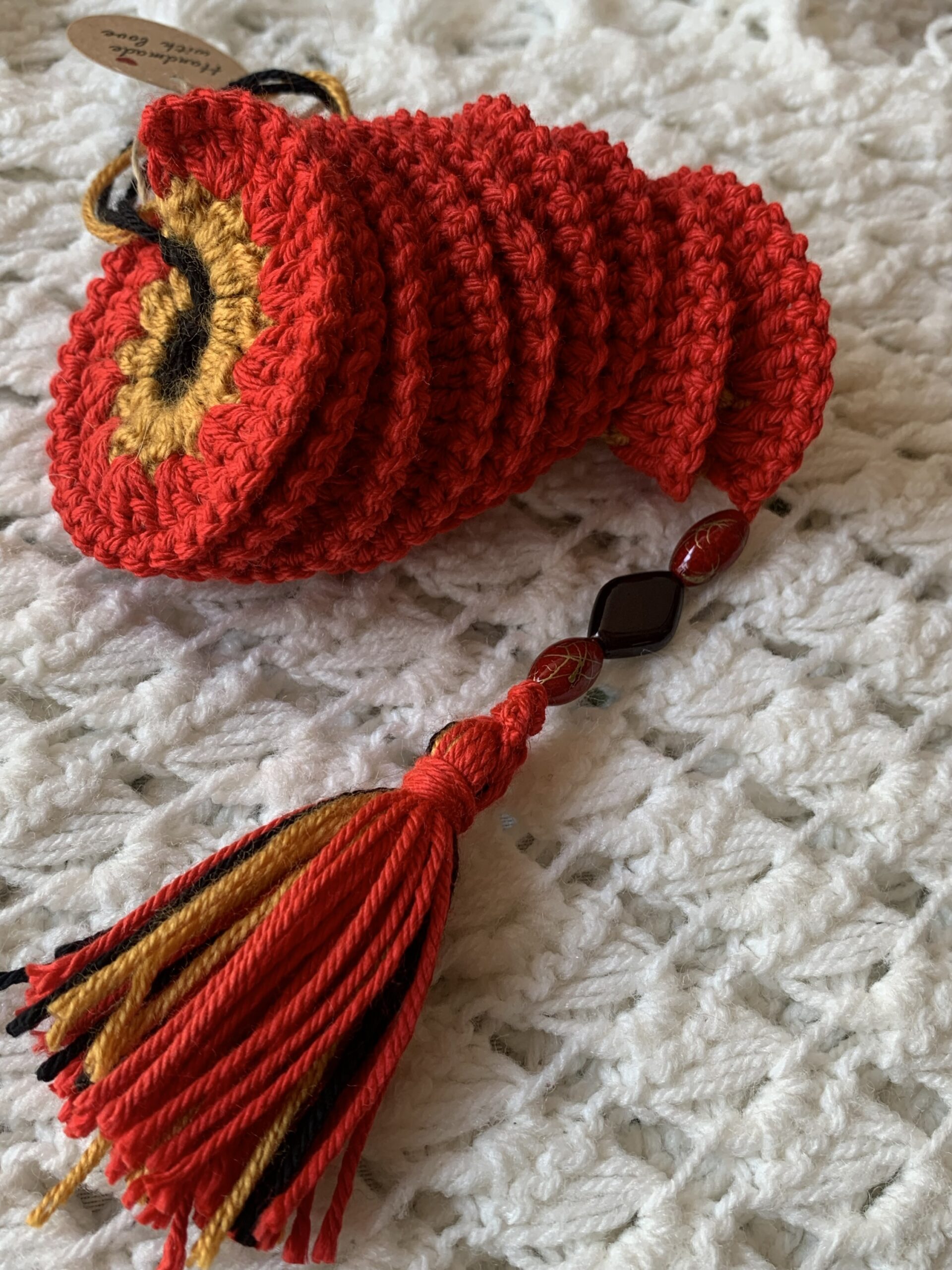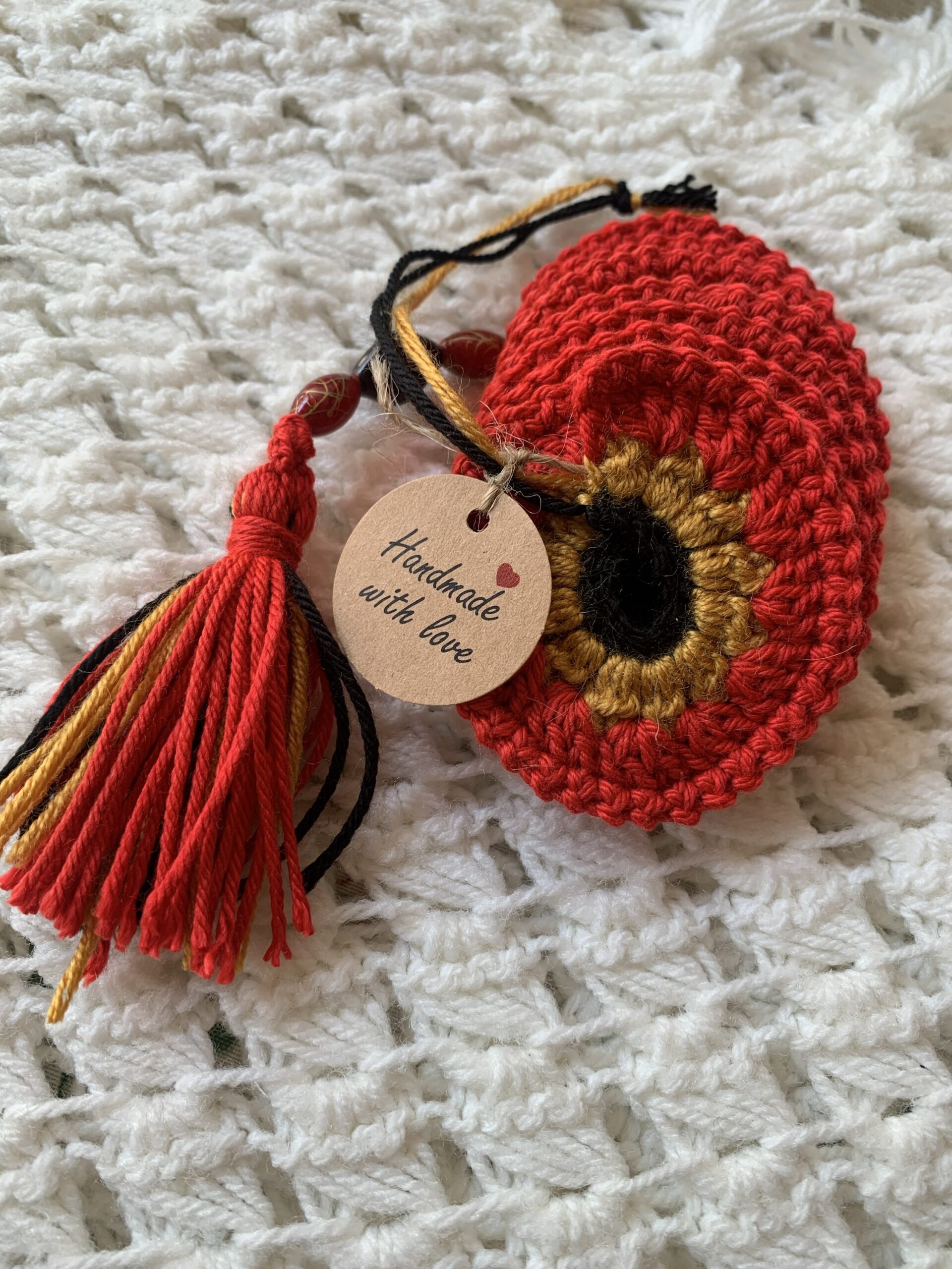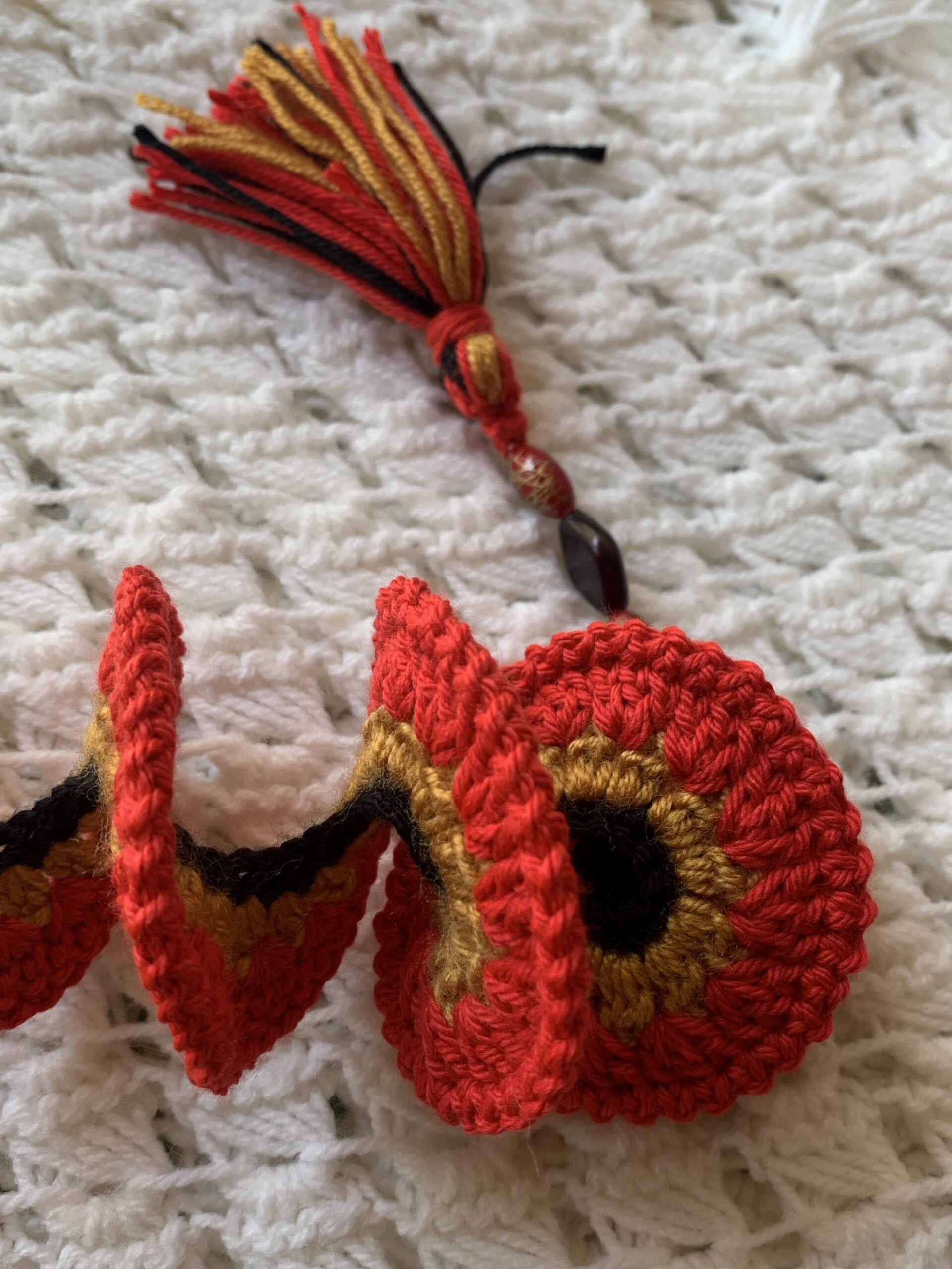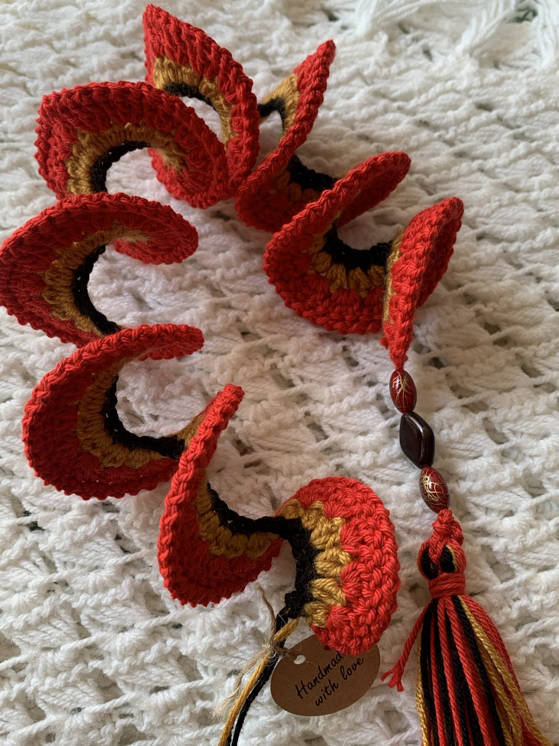 Molinillo de viento o Wind Spinner hecho a mano de ganchillo con hilo de algodón de color rojo y negro.