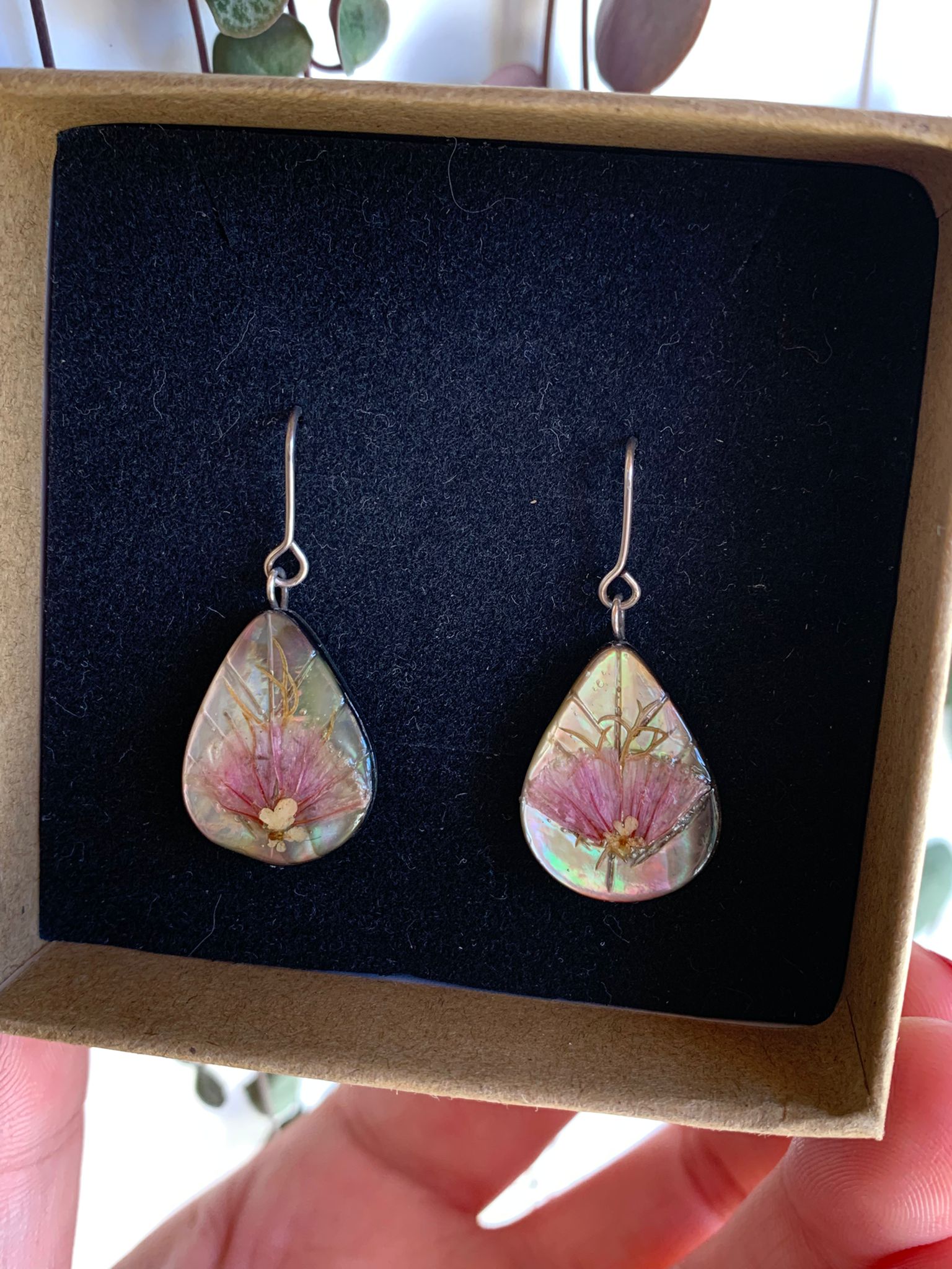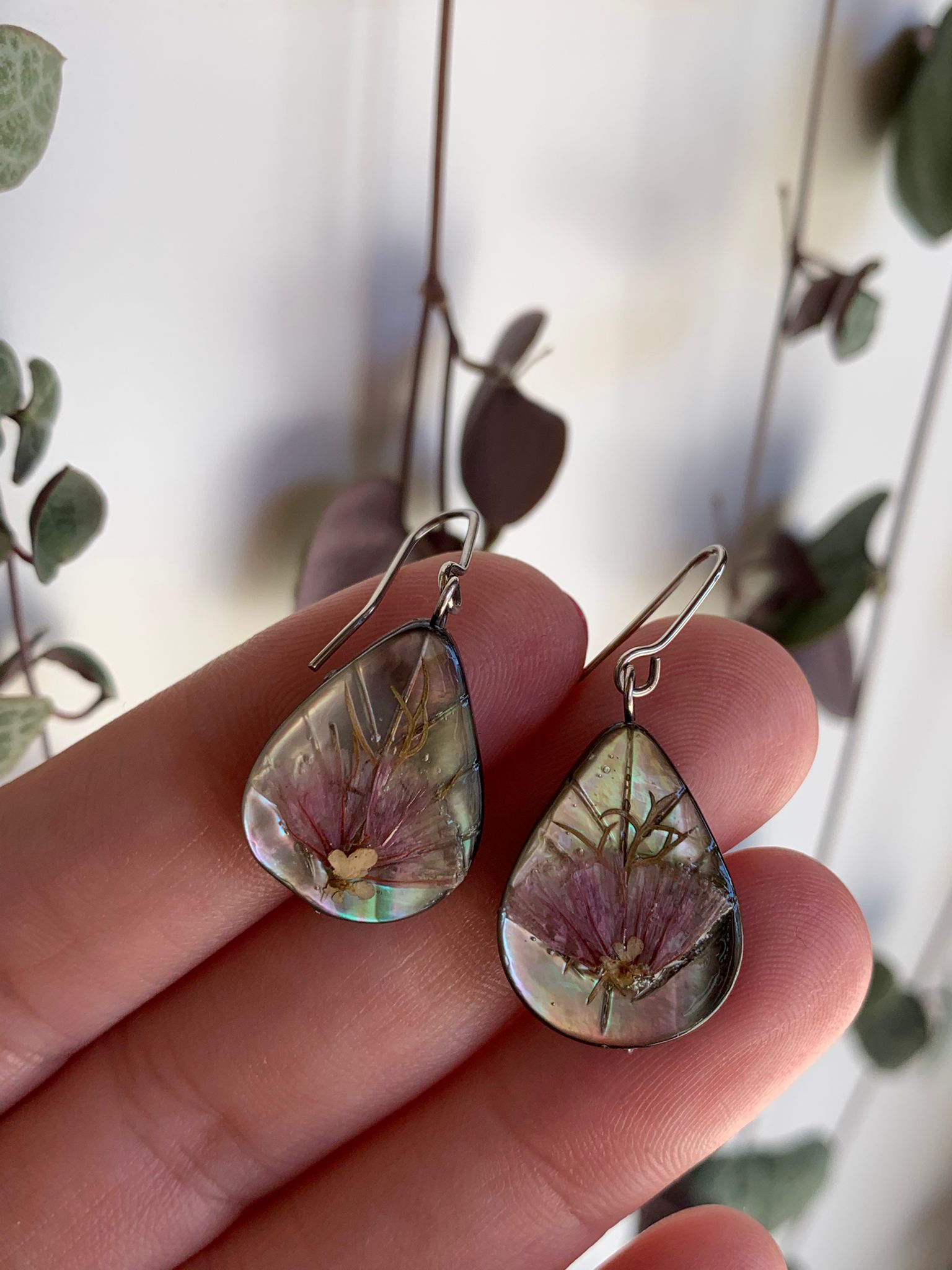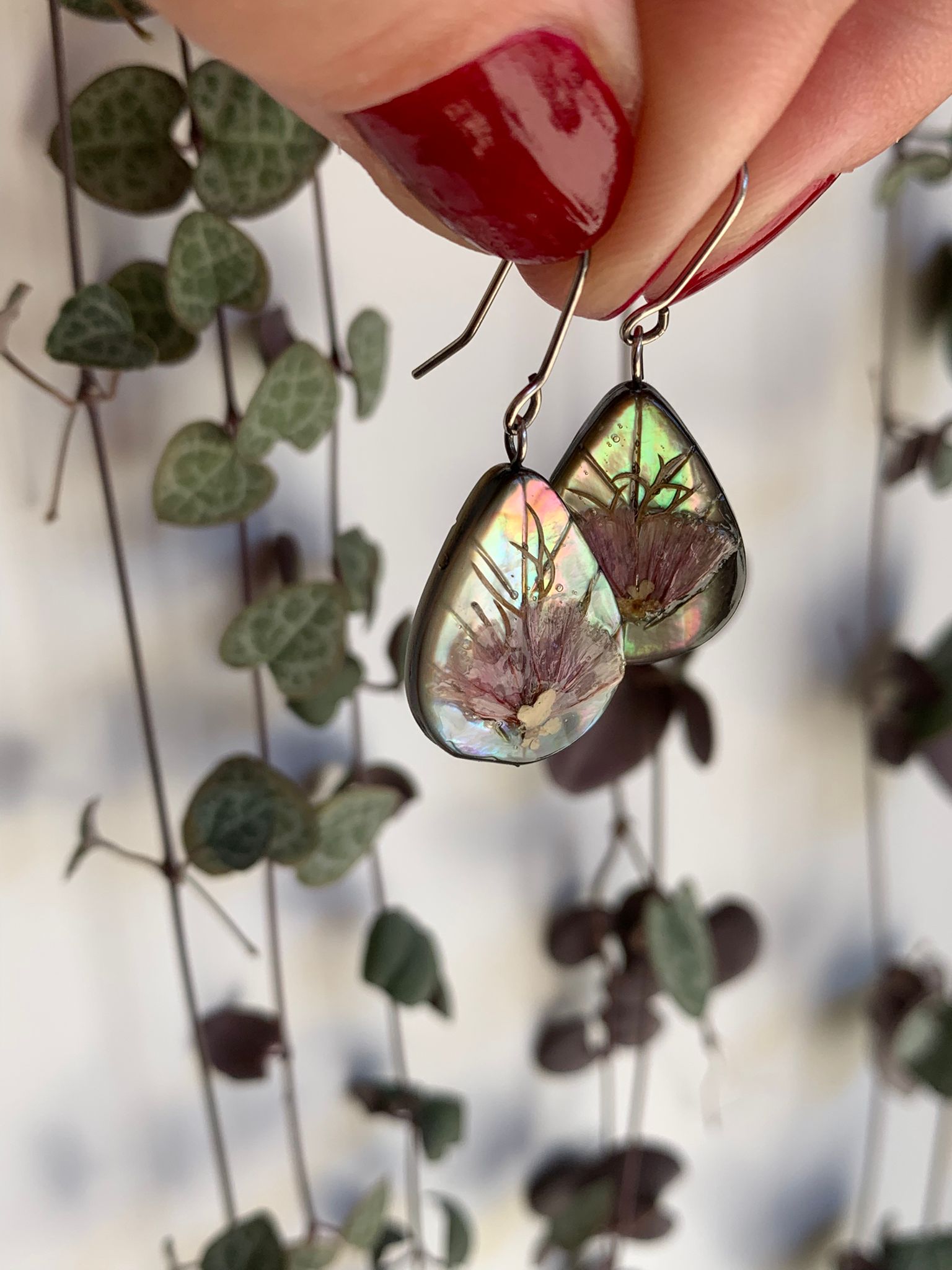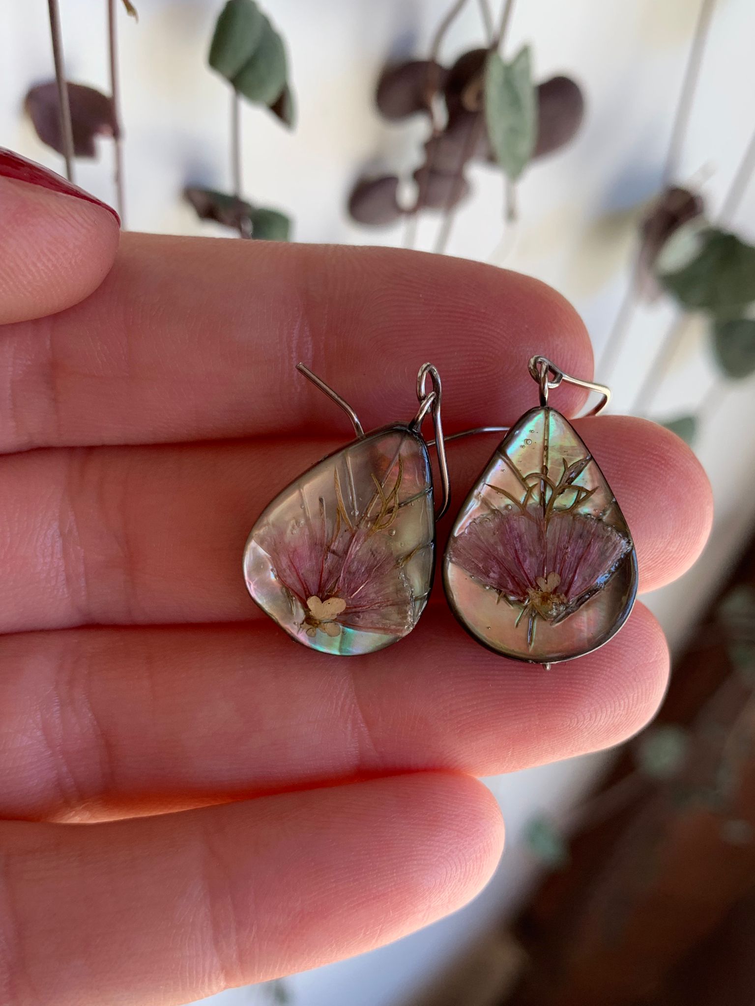 Pendientes únicos hechos a mano de abulón y flores naturales de bougainvillea. Como todas las joyas de la colección Plata y Flores, estos pendientes también tienen ganchos de plata de ley.