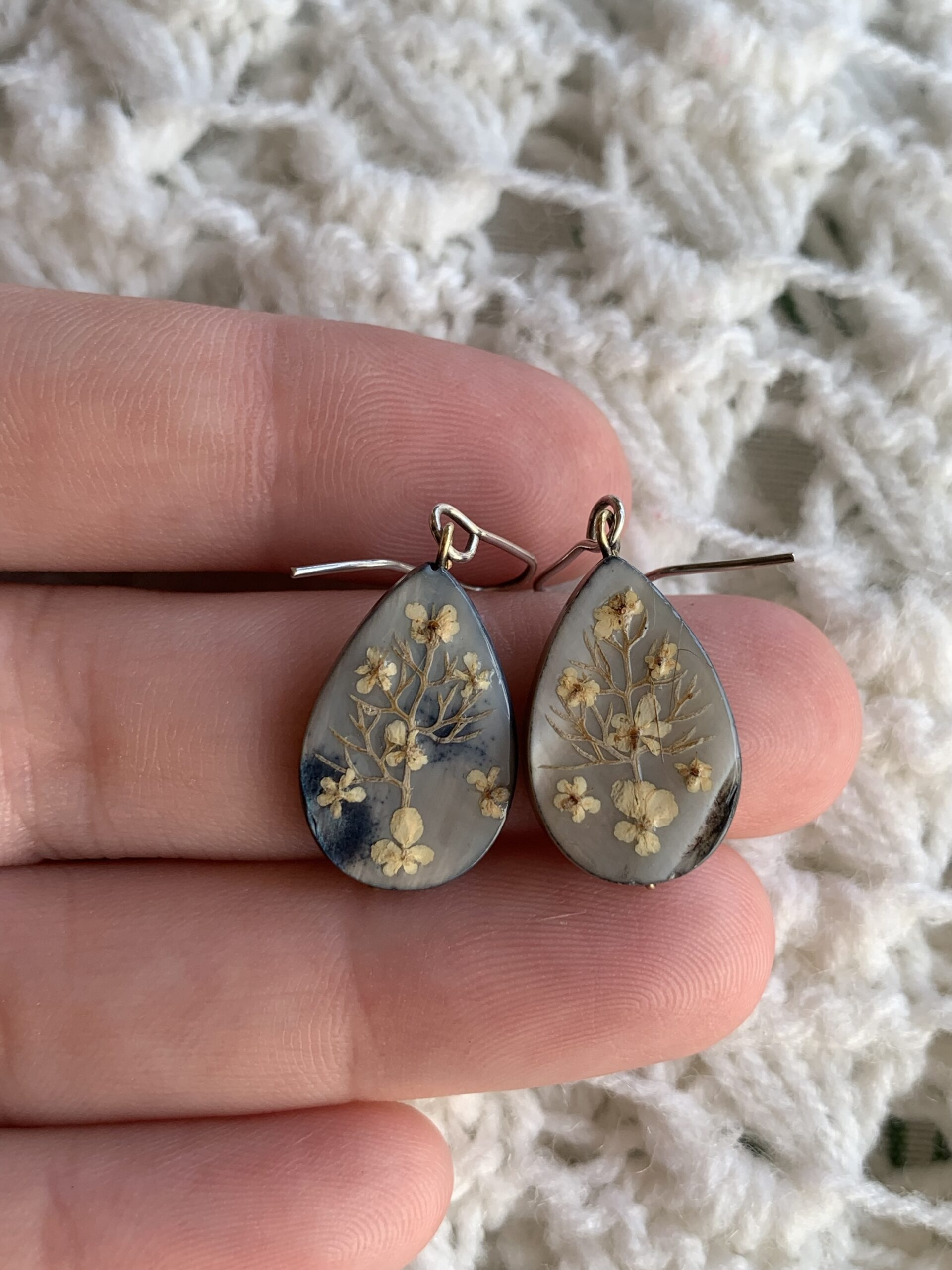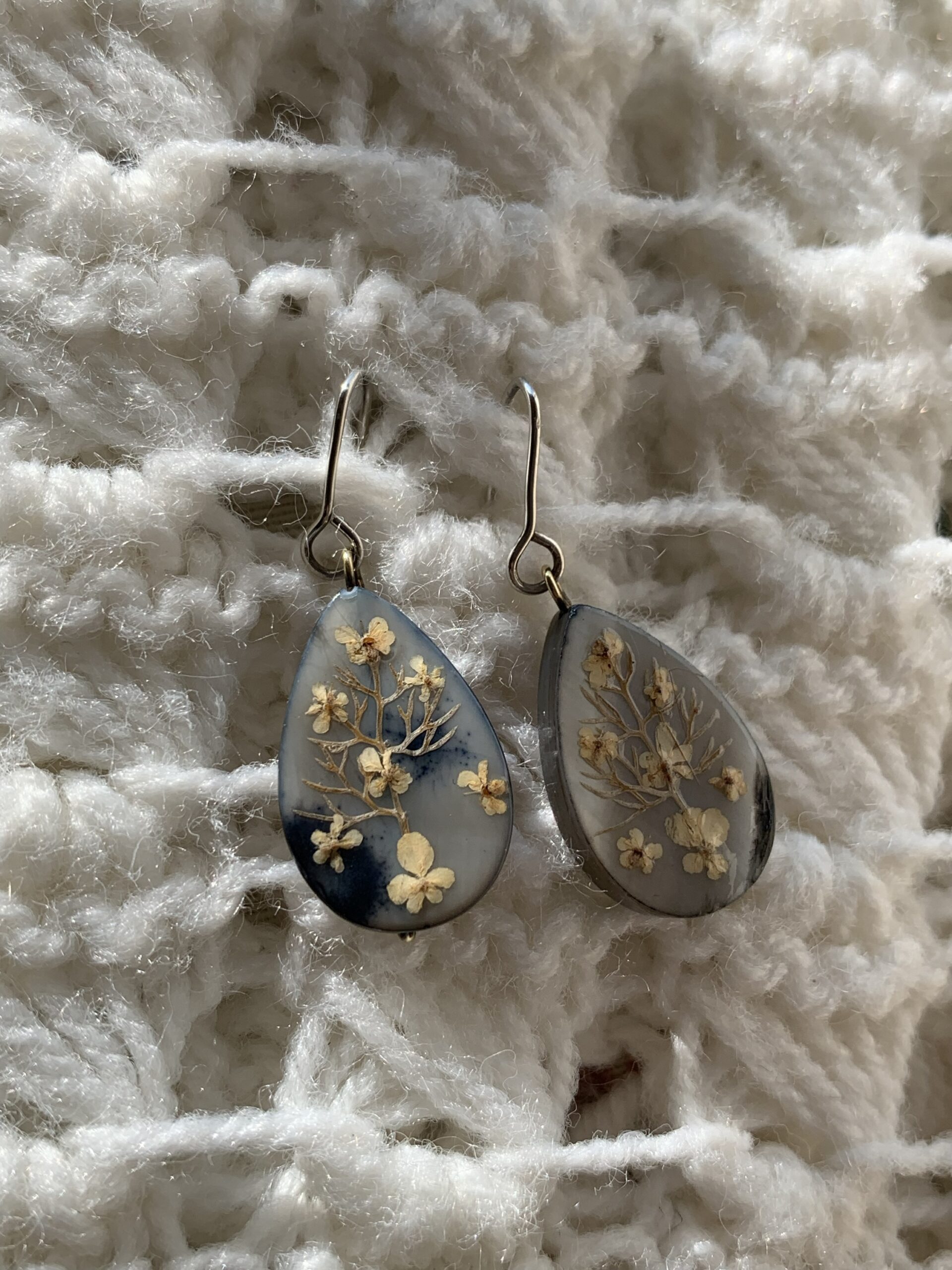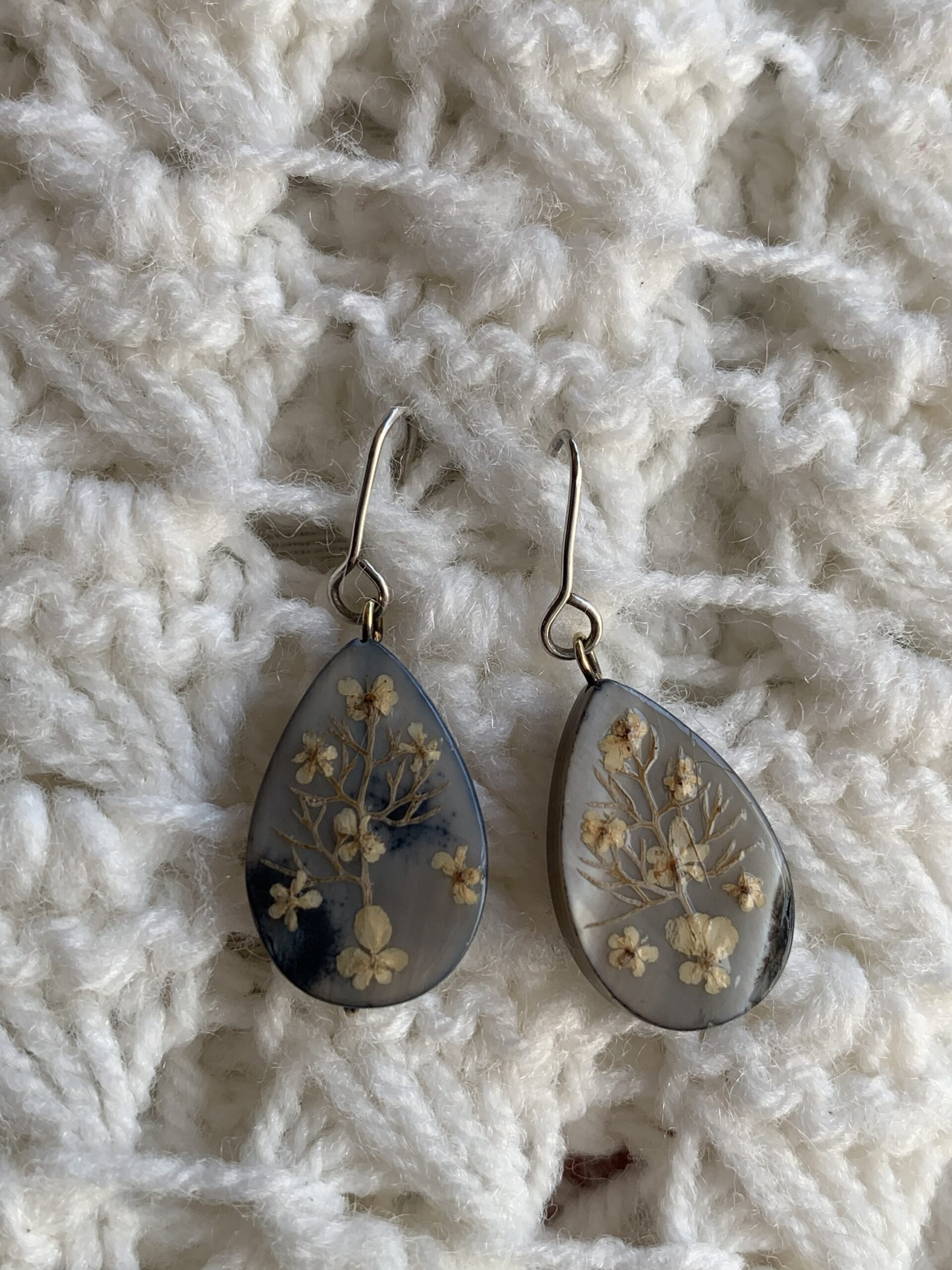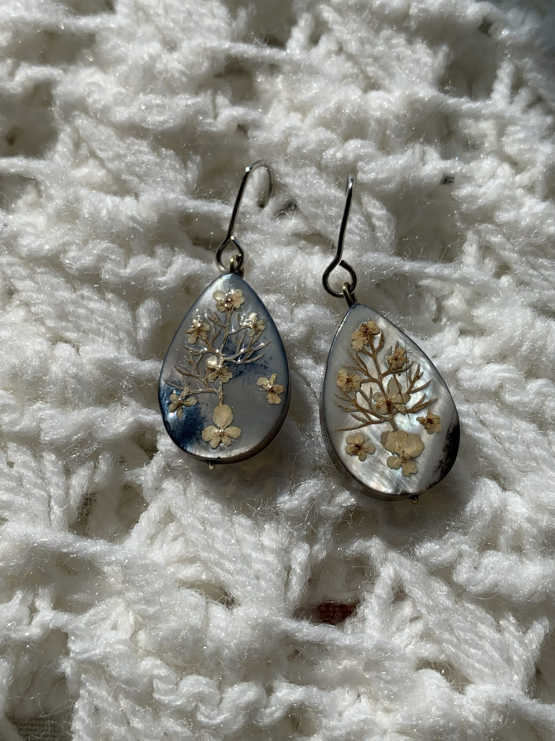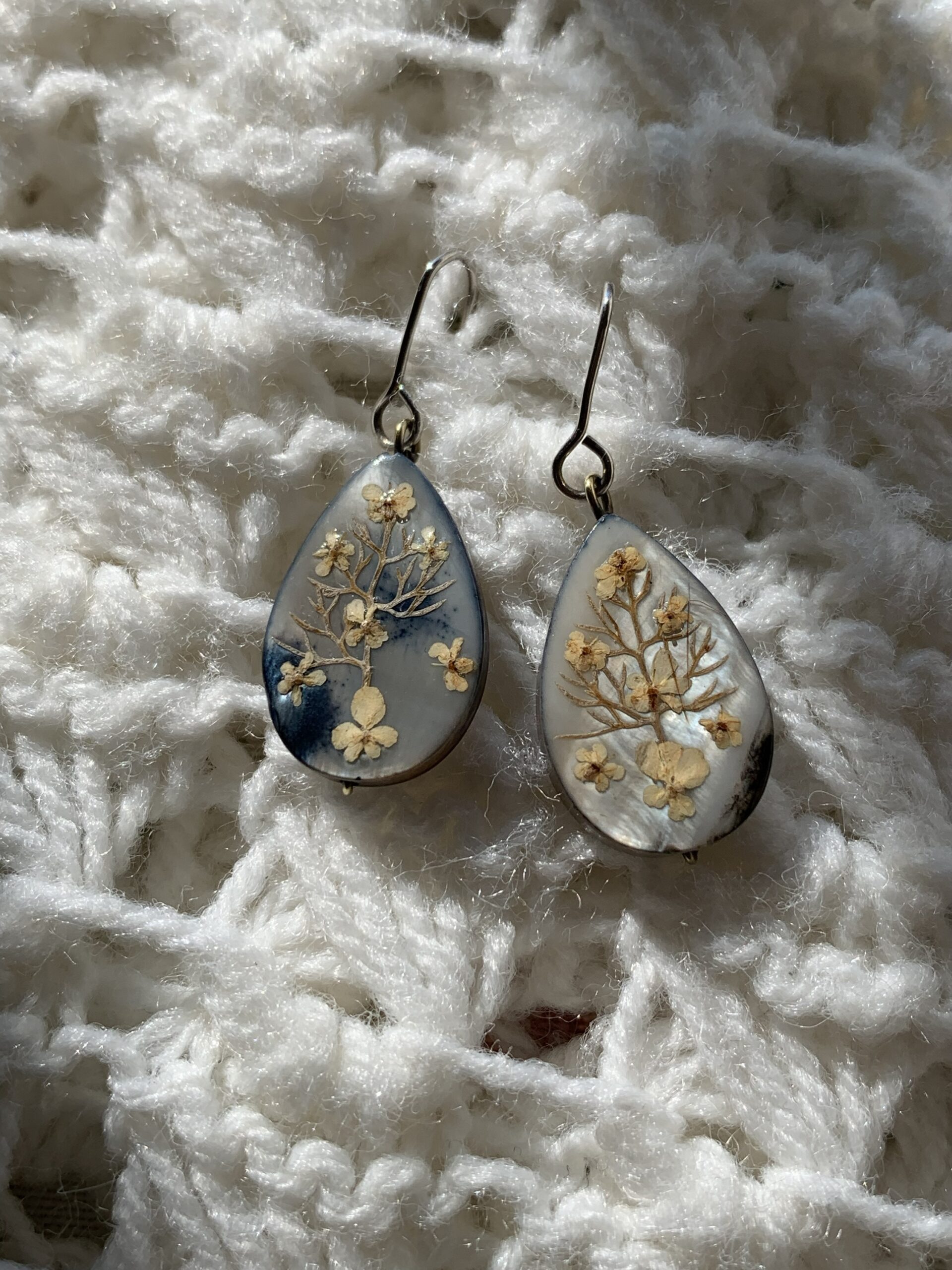 Pendientes artesanales de la colección Plata y Flores hechos con abalon, flores naturales y plata de leylas lagrima de abalon reflejan unos tonod azules y blanco perlado tal como se aprecia en las fotos.
